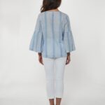 A light shade of white & blue striped blouse featuring voluminous, flared long sleeves.